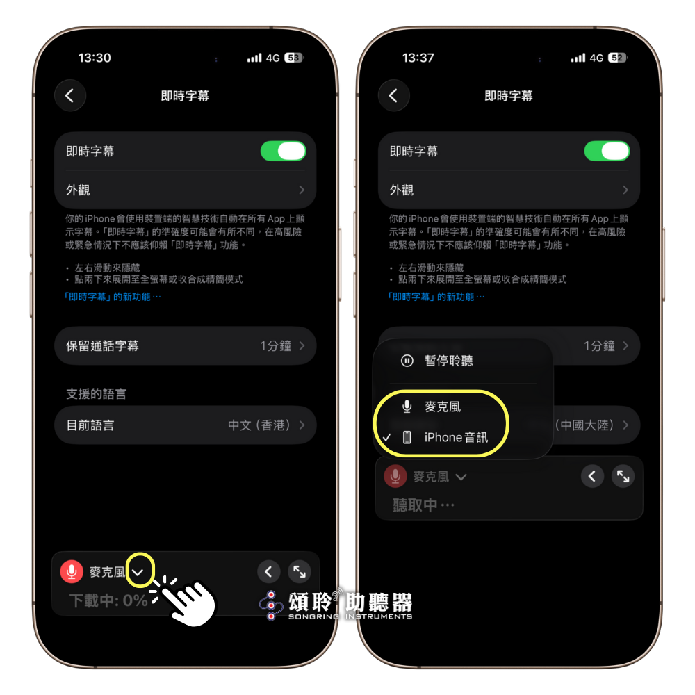 如果聽音樂、講電話、Podcast等,可切換成「iPhone音訊」,就可以直接抓iPhone內部聲音並轉為顯示字幕。