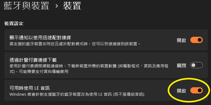2. 在 [ 藍牙 & 裝置 > 裝置] 視窗的 [ 裝置設定 ] 區段底下,確定 [ 可用時使用 LE 音訊 ] 設定已開啟。