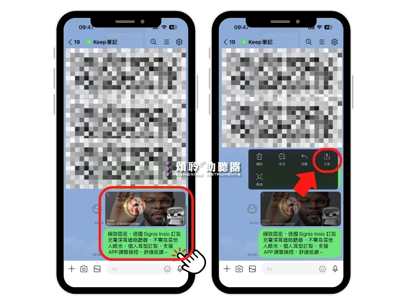 如果您想傳送多則訊息或圖片,點選想分享的訊息,然後點選「分享」。