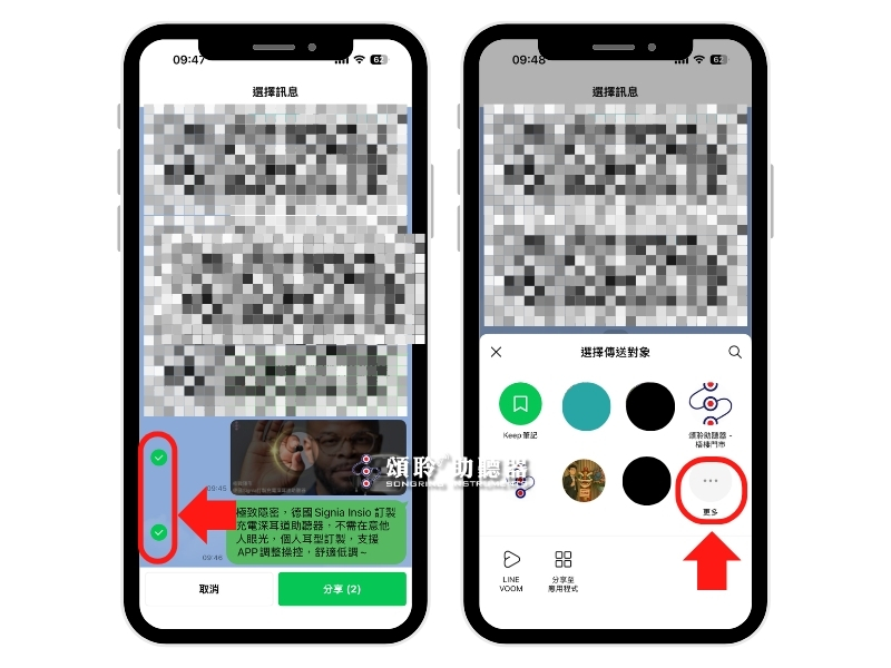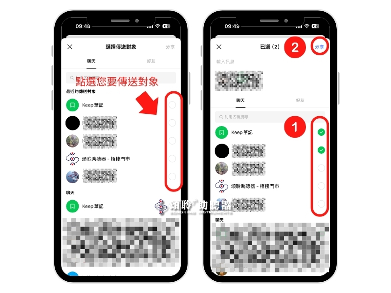 接下來您可以選擇多個好友或群組(一次最多可選 15 個對象),選擇後點選右上角「分享」就可以發送出去囉~
