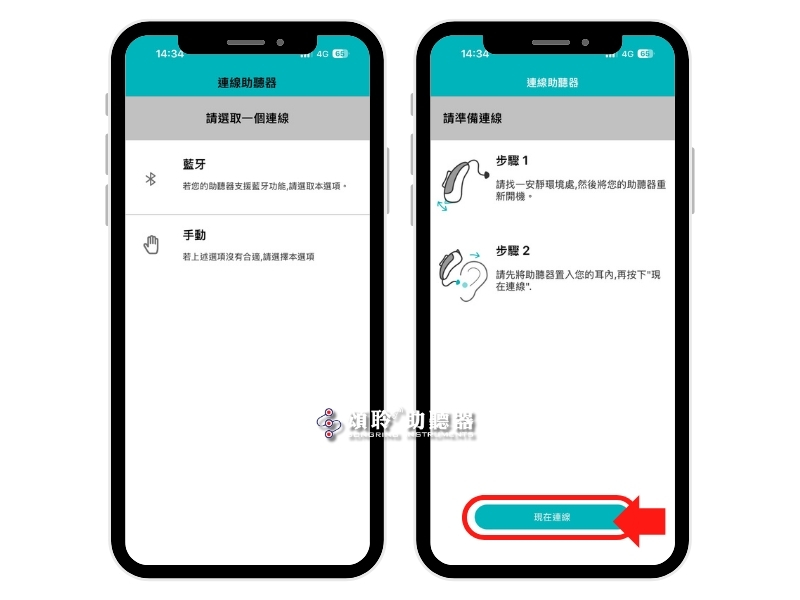 將您的助聽器重新開機並戴上,接著請點選「現在連線」