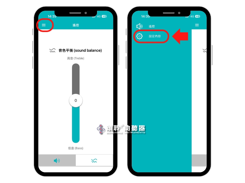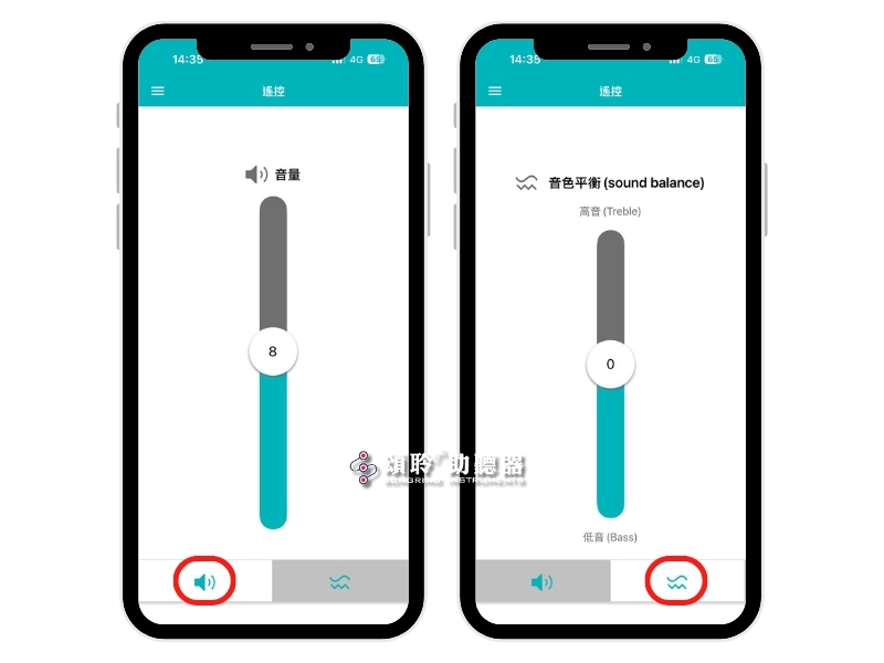 Vibe App提供音量、以及音色平衡調整功能,您可以挪移中間的調整鈕調整助聽器。