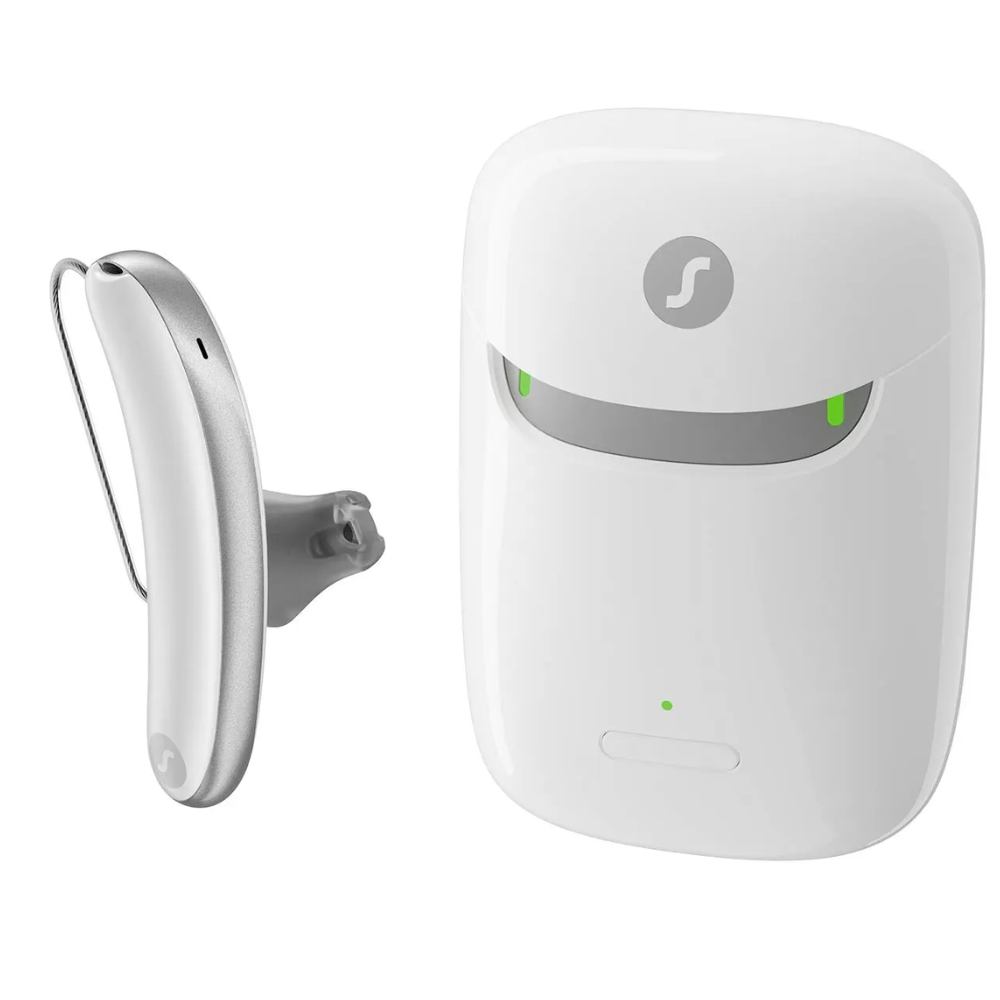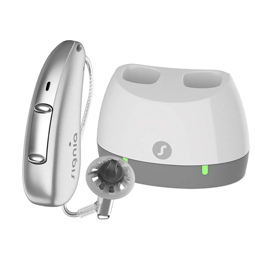 CROS 3D 戴樂多 Styletto AX 不僅為聽損者提供純淨立體對話,也兼顧了完整的助聽器功能,包括採用 Qi 技術的無線充電、Android 和 iPhone 直接藍芽連線以及具有 AI 智慧的 Signia 西嘉小幫手。